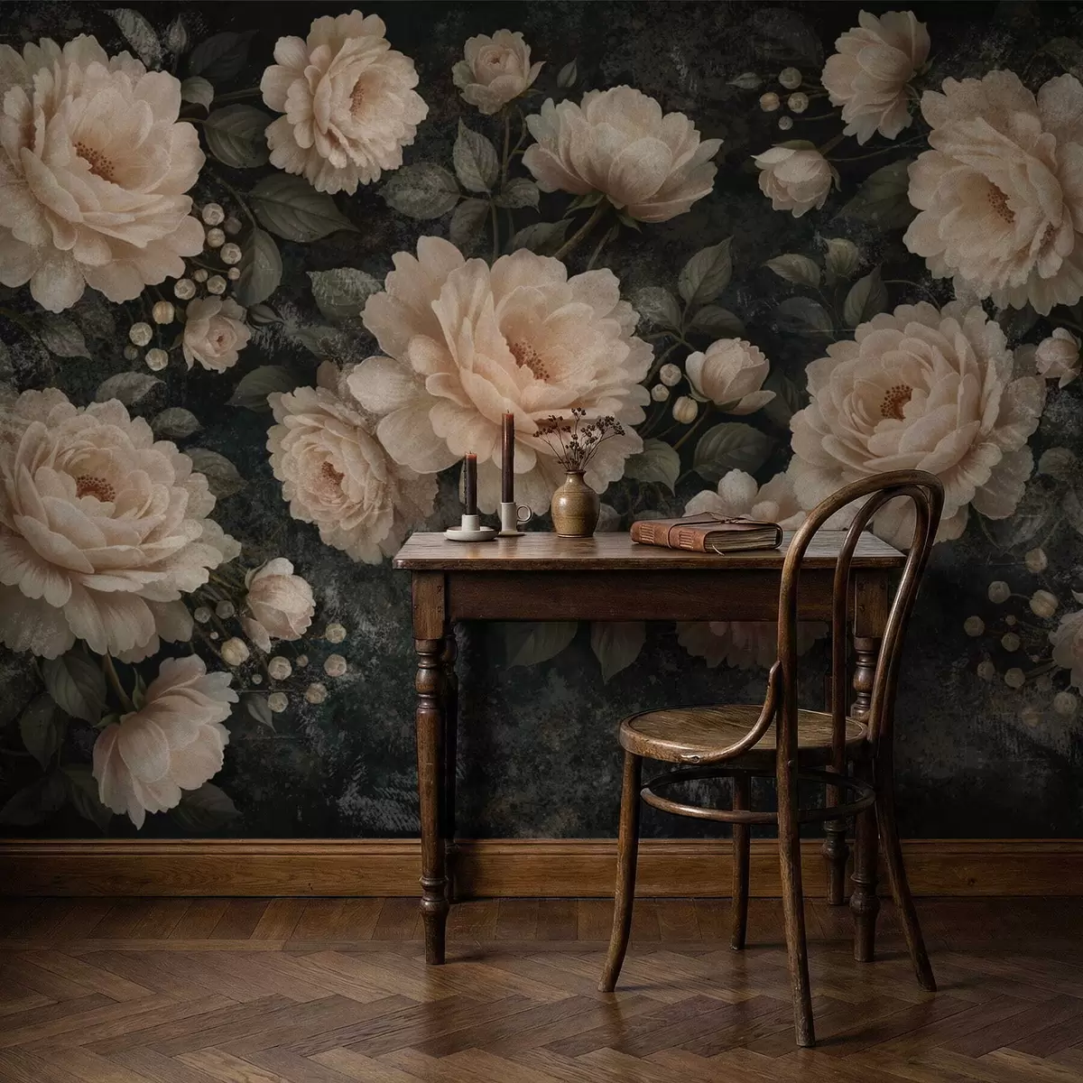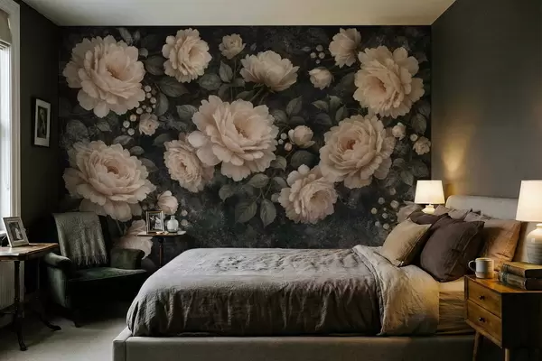 Murais de parede Flores volumosas em tons de bege sobre fundo escuro Nr. w05114