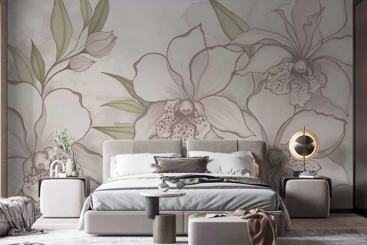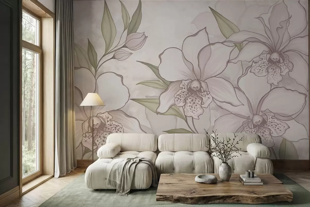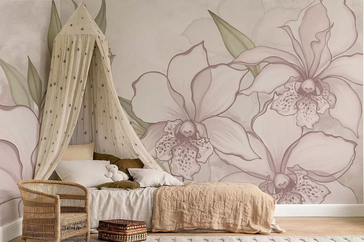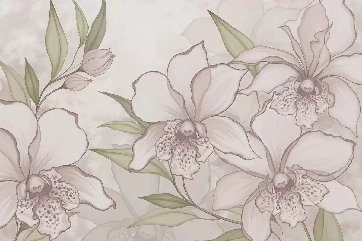 Murais de parede Ilustração de orquídeas claras com folhas sobre fundo bege Nr. w05117