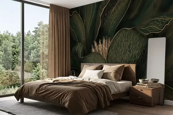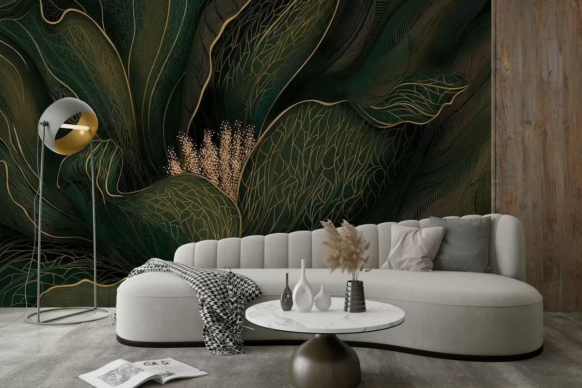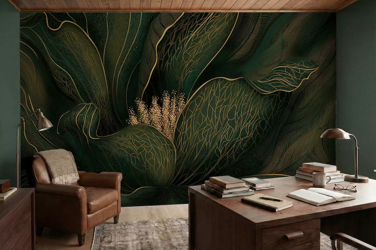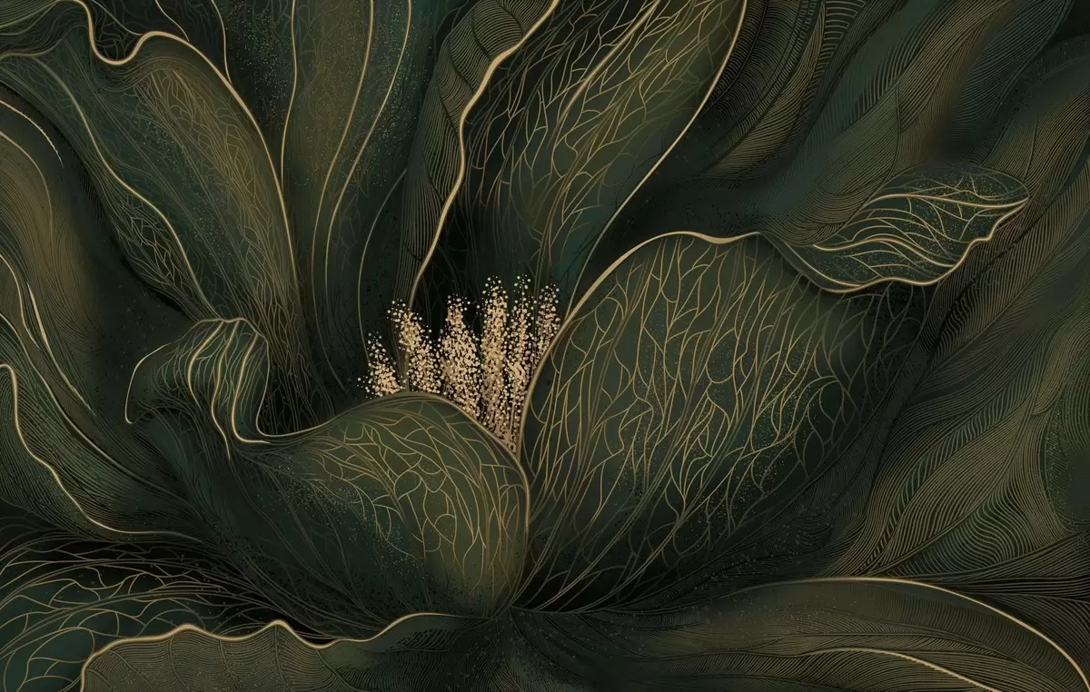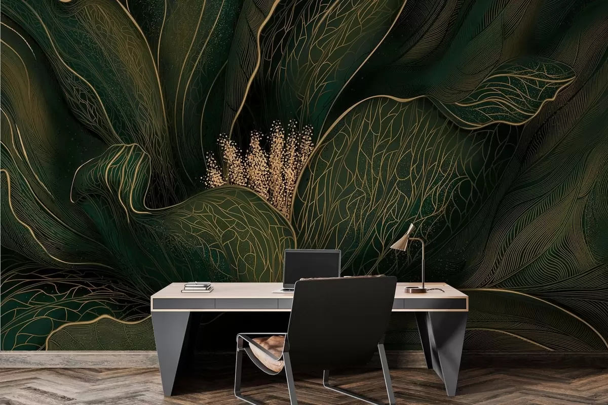 Murais de parede Flor abstrata em verde escuro com detalhes em linhas finas Nr. w05119v1