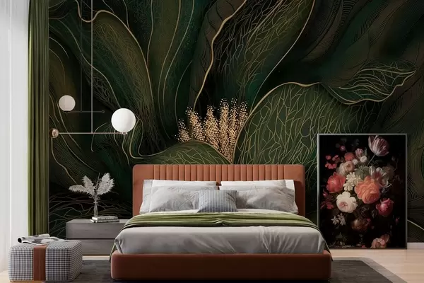 Murais de parede Flor abstrata em verde escuro com detalhes em linhas finas Nr. w05119v1
