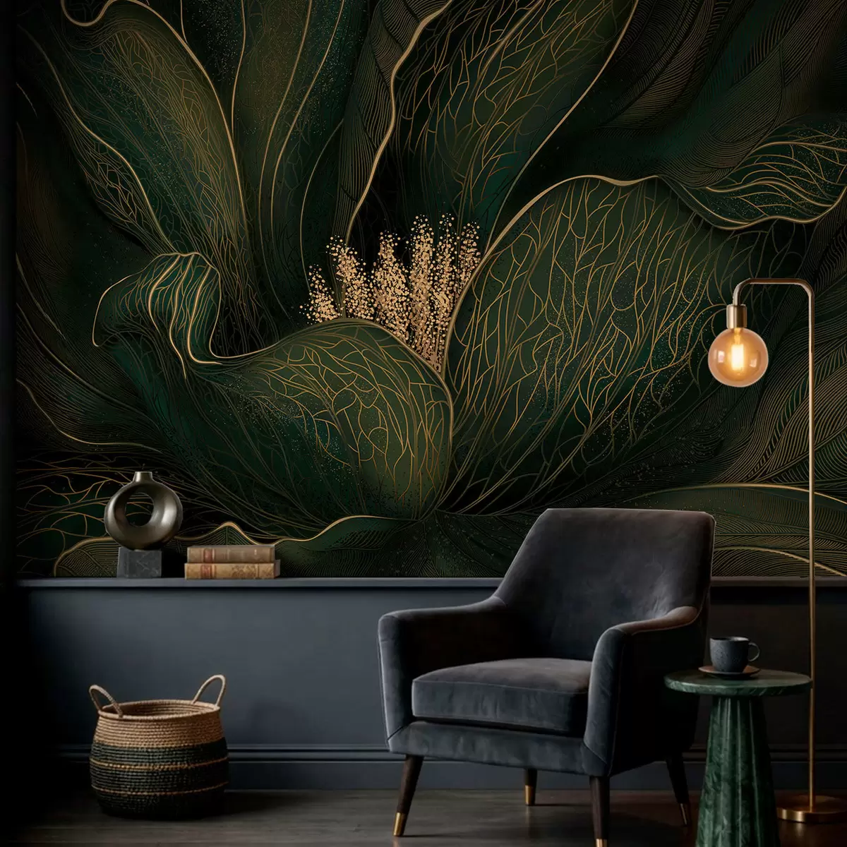 murais de parede Flor abstrata em verde escuro com detalhes em linhas finas w05119v1