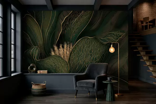 Murais de parede Flor abstrata em verde escuro com detalhes em linhas finas Nr. w05119v1