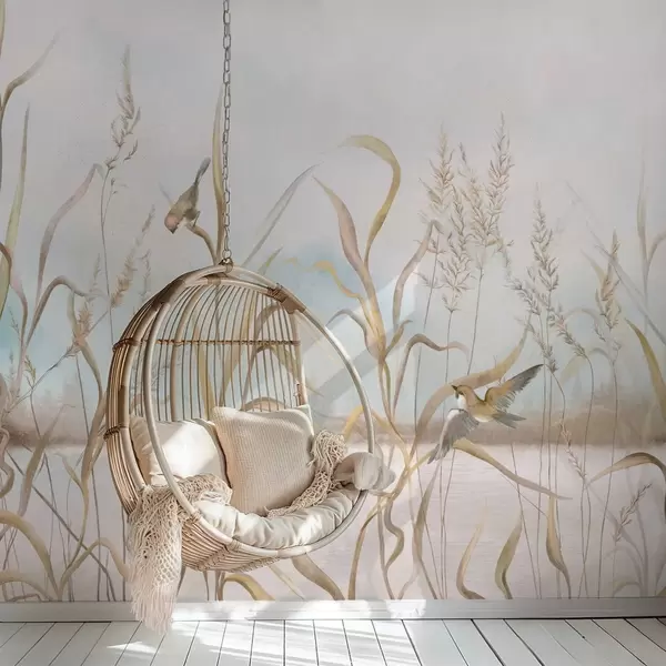 Murais de parede Ilustração de juncos e pássaros à beira da água em tons suaves Nr. w05125