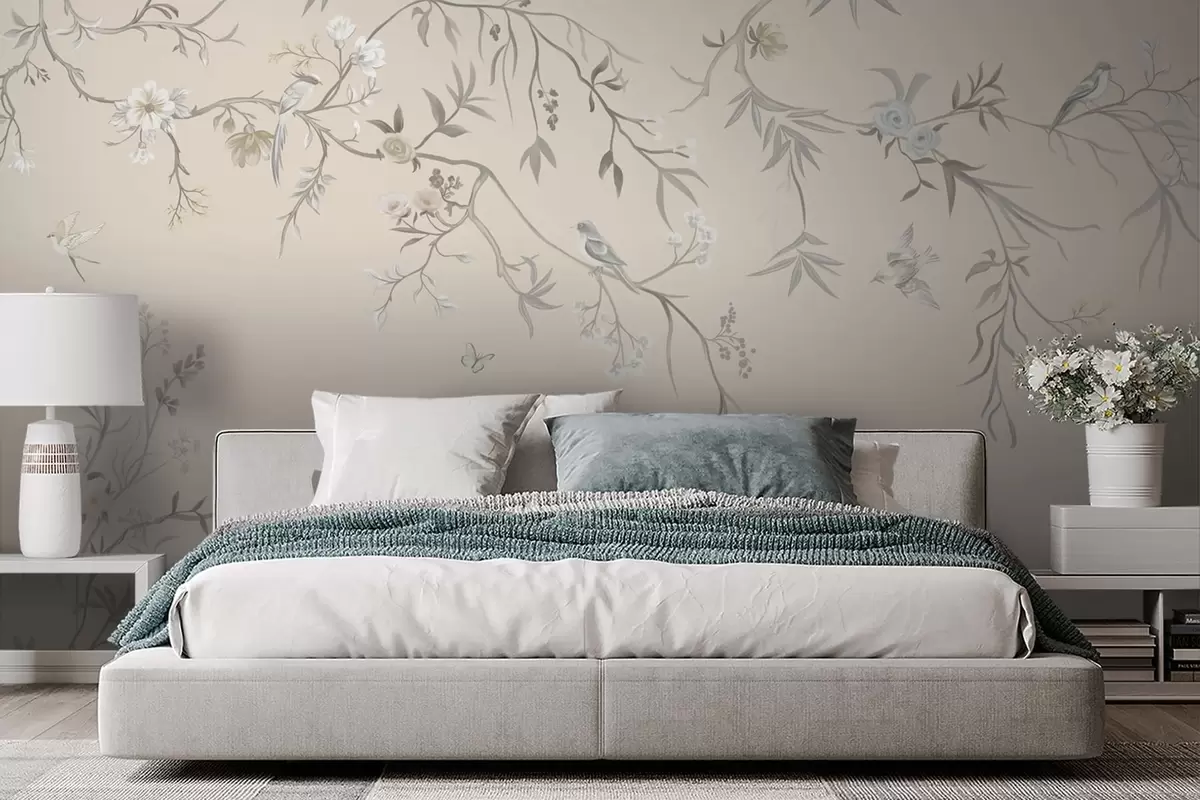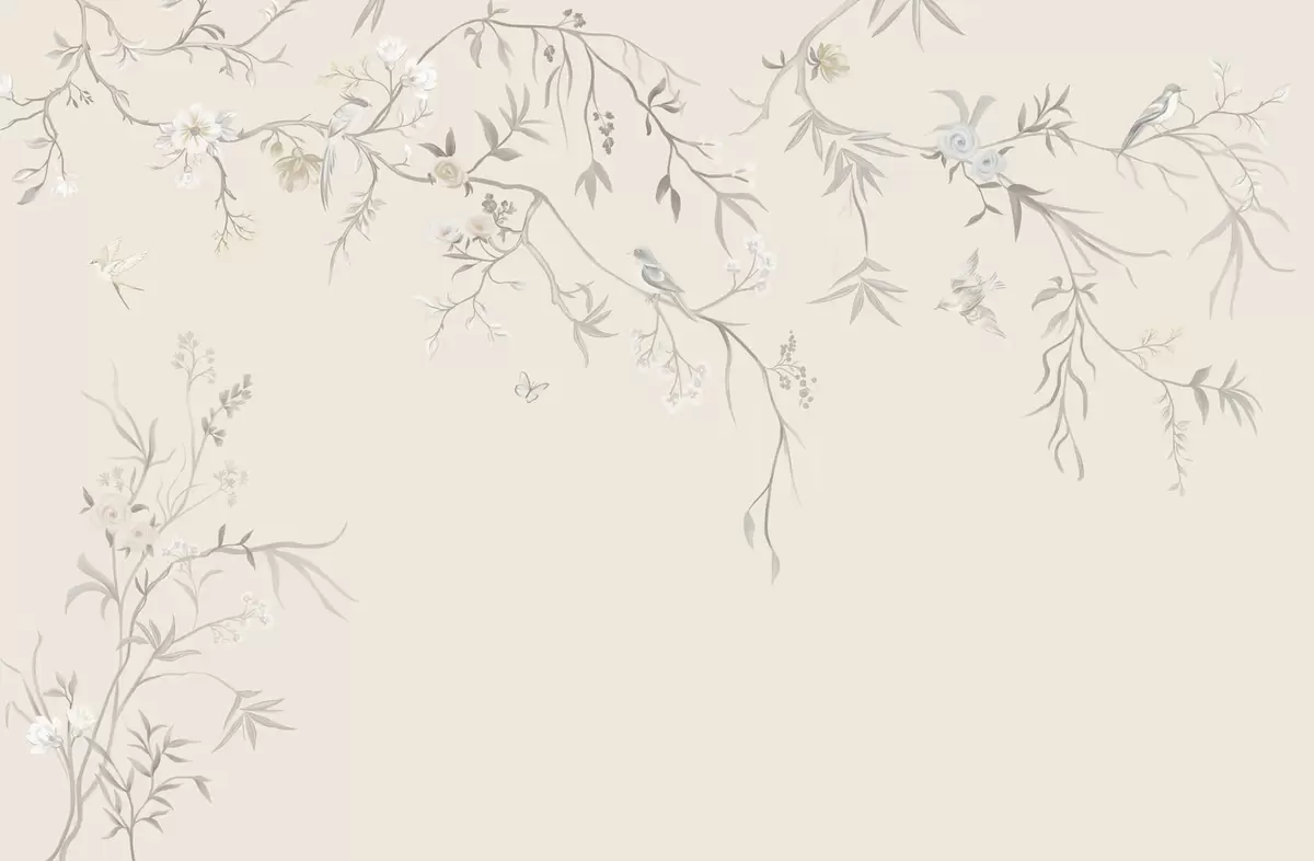Murais de parede Galhos florais com pássaros em um fundo claro Nr. w05127v7