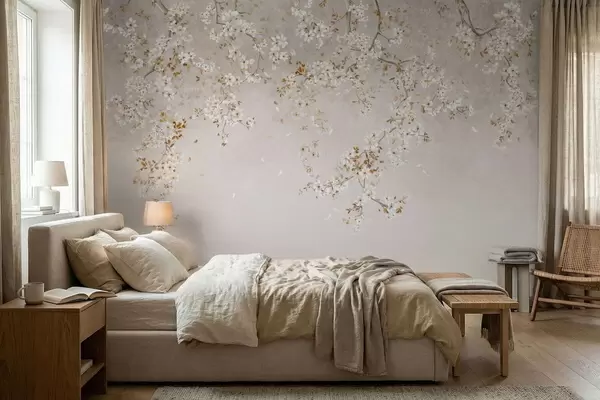 Murais de parede Galhos com flores brancas sobre um fundo bege suave Nr. w05129