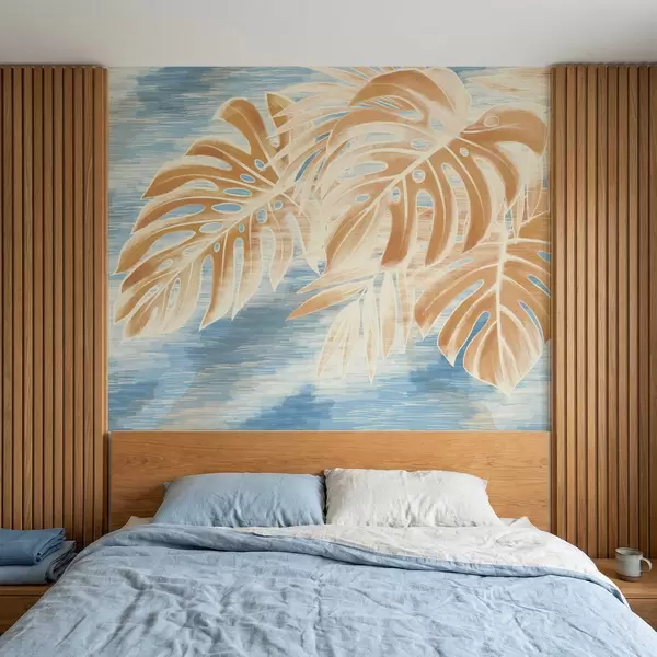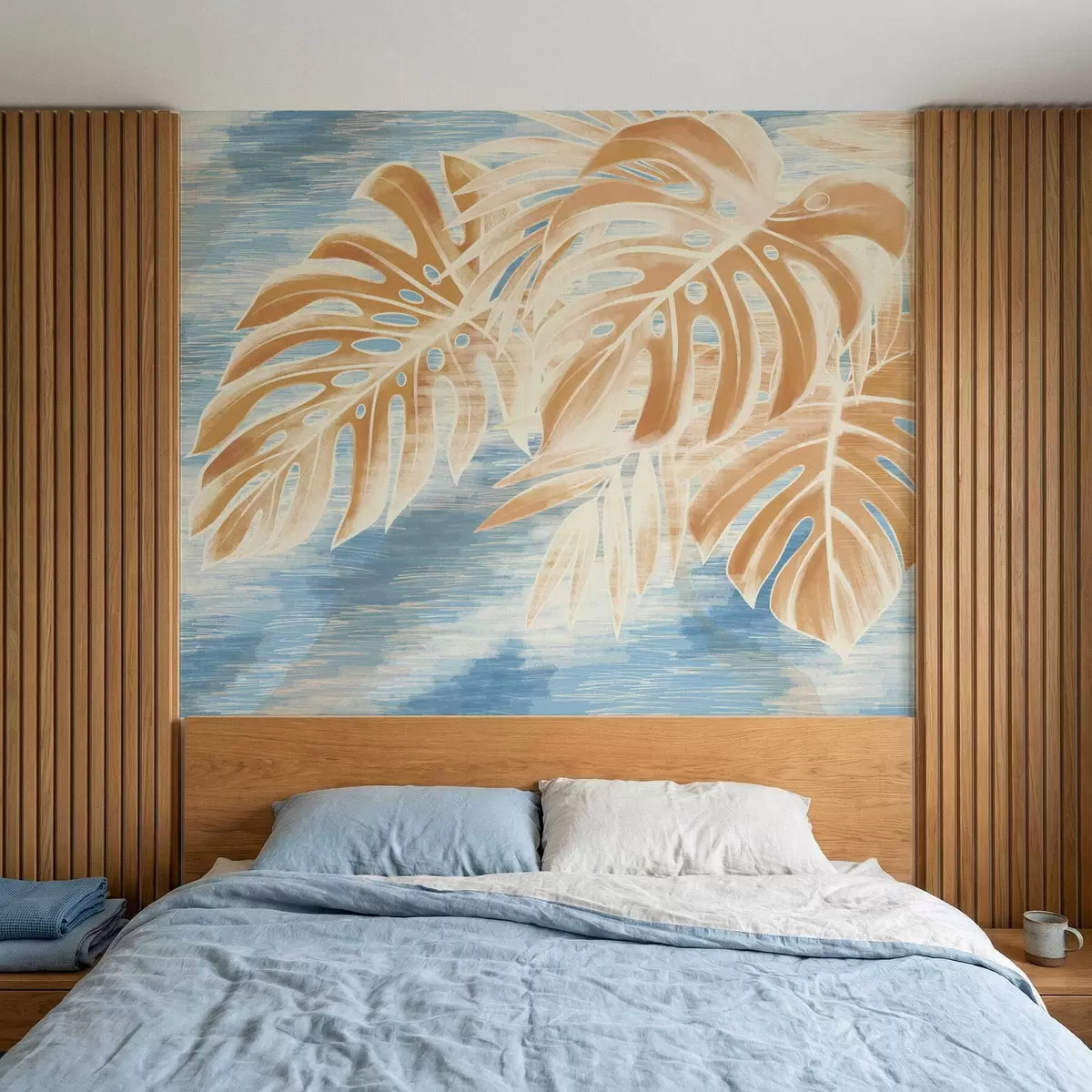 Murais de parede Folhas em tons claros de areia sobre fundo azul Nr. w05130v1