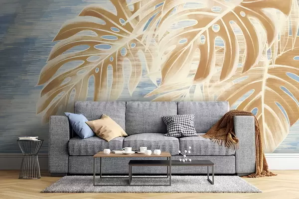 Murais de parede Folhas em tons claros de areia sobre fundo azul Nr. w05130v1
