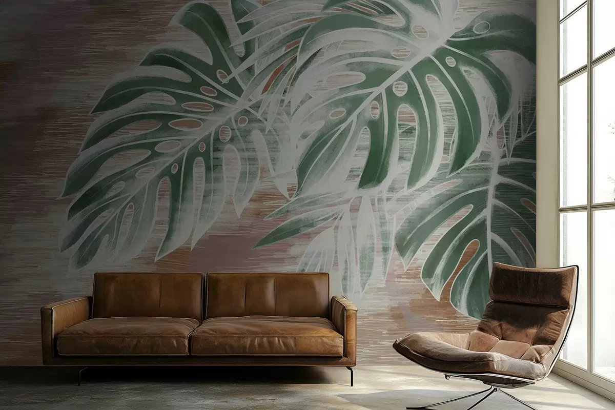 Murais de parede Folhas verdes sobre uma base abstrata com textura quente Nr. w05130v3
