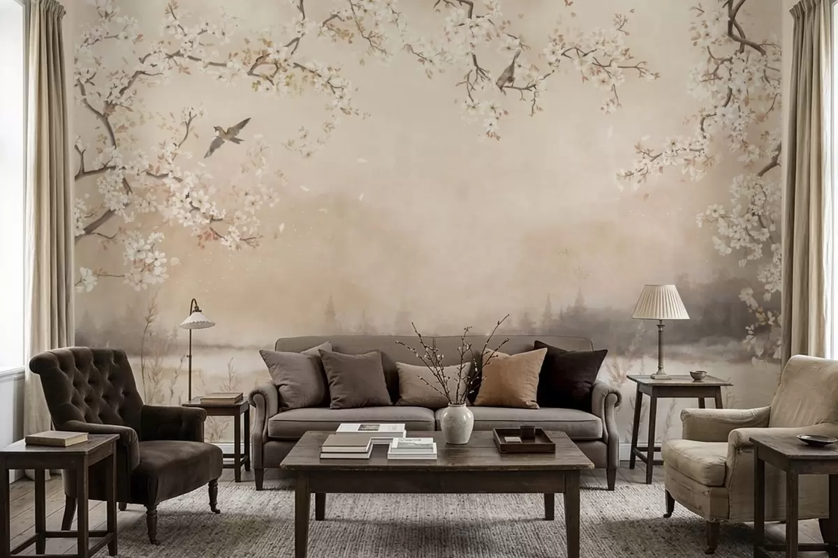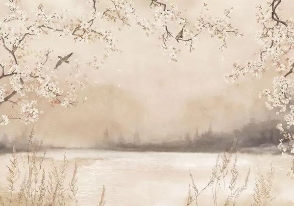 Murais de parede Ramos delicados em flor junto ao lago com pássaros na névoa leve Nr. w05155