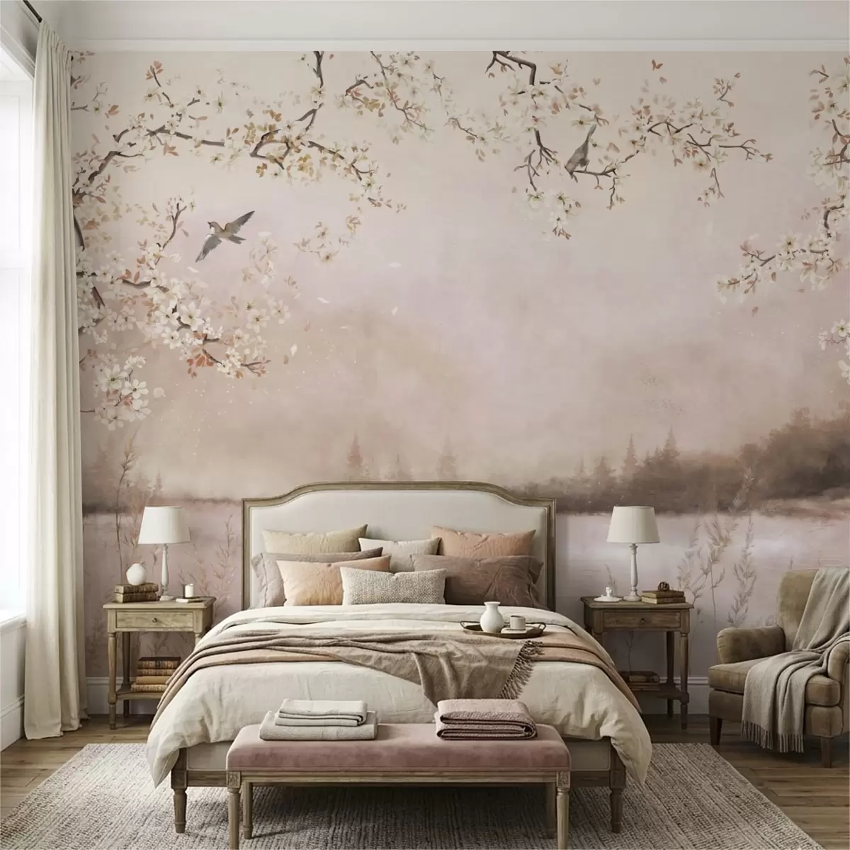 Murais de parede Galhos floridos sobre um lago calmo com pássaros na névoa Nr. w05155v1