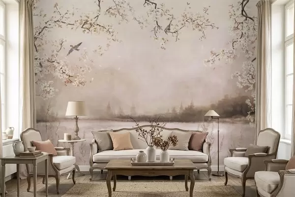 Murais de parede Galhos floridos sobre um lago calmo com pássaros na névoa Nr. w05155v1