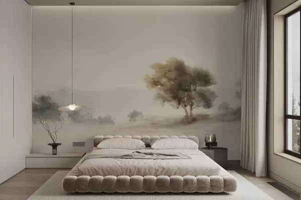 Murais de parede Paisagem minimalista com uma árvore solitária na névoa Nr. w05223