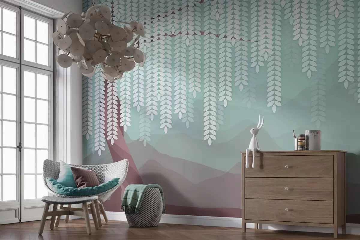 Murais de parede Salgueiro estilizado com folhas pendentes contra um fundo de montanhas minimalistas em tons de chocolate e turquesa. Nr. w05232v1