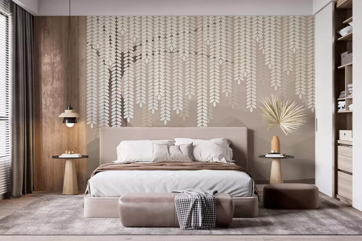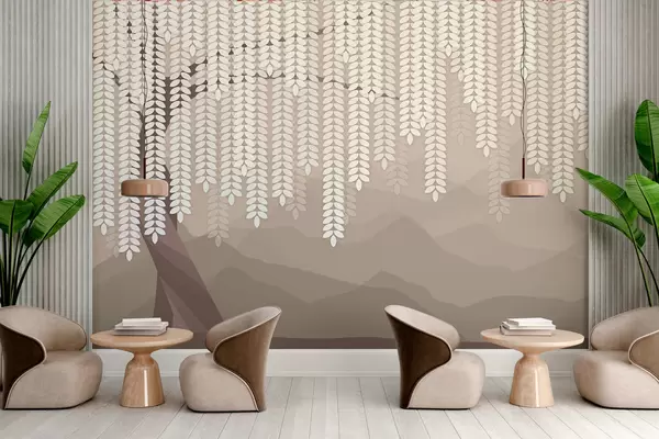 Murais de parede salgueiro estilizado com folhas pendentes contra um fundo de montanhas minimalistas em tons de café Nr. w05232v2
