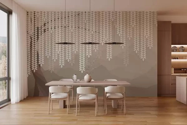 Murais de parede salgueiro estilizado com folhas pendentes contra um fundo de montanhas minimalistas em tons de café Nr. w05232v2