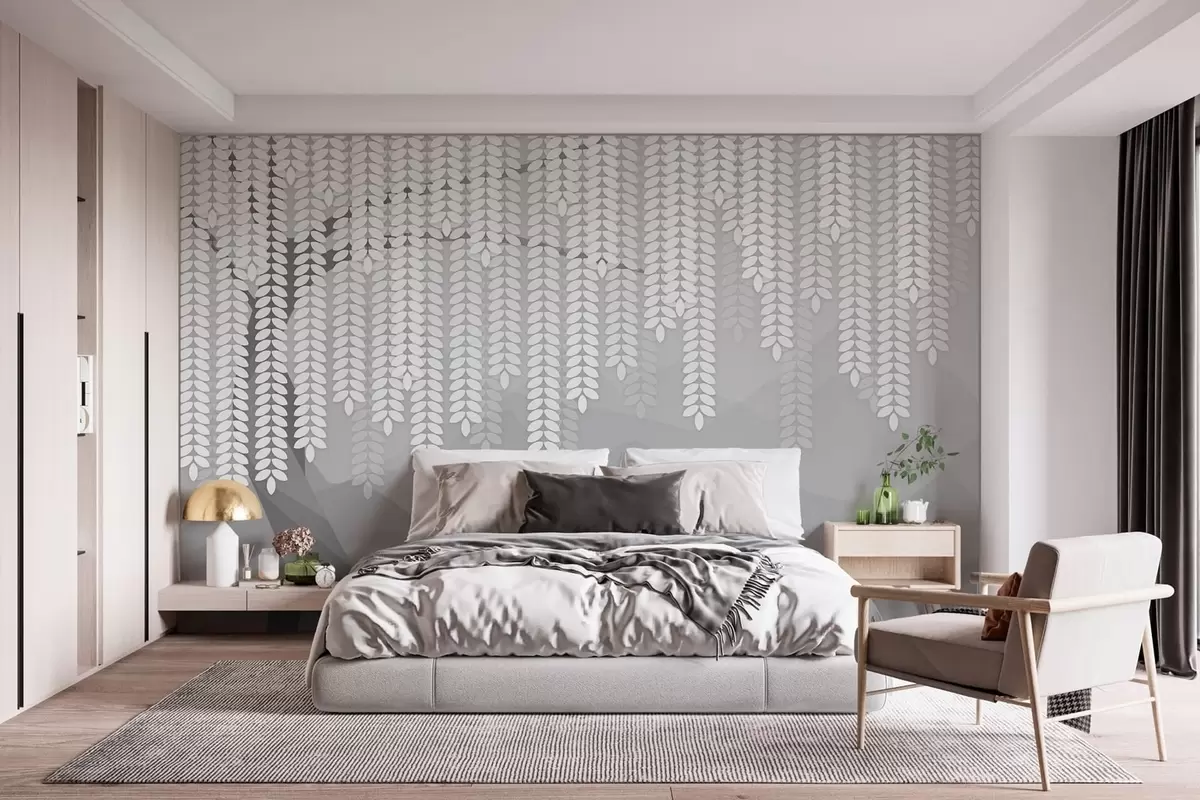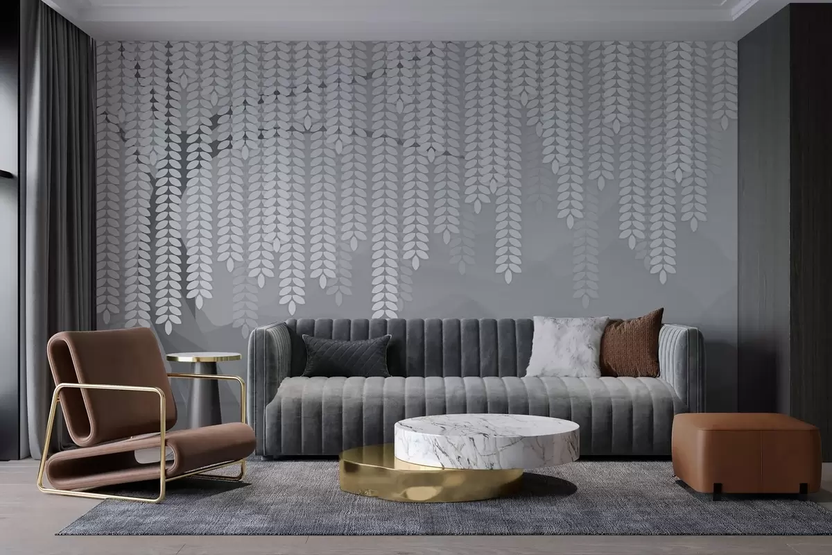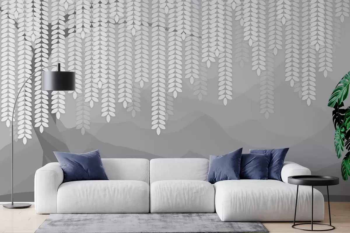Murais de parede salgueiro estilizado com folhas pendentes contra um fundo de montanhas minimalistas em tons de cinza Nr. w05232v3