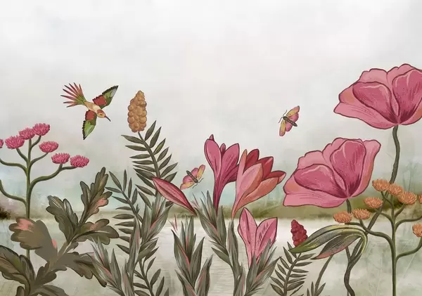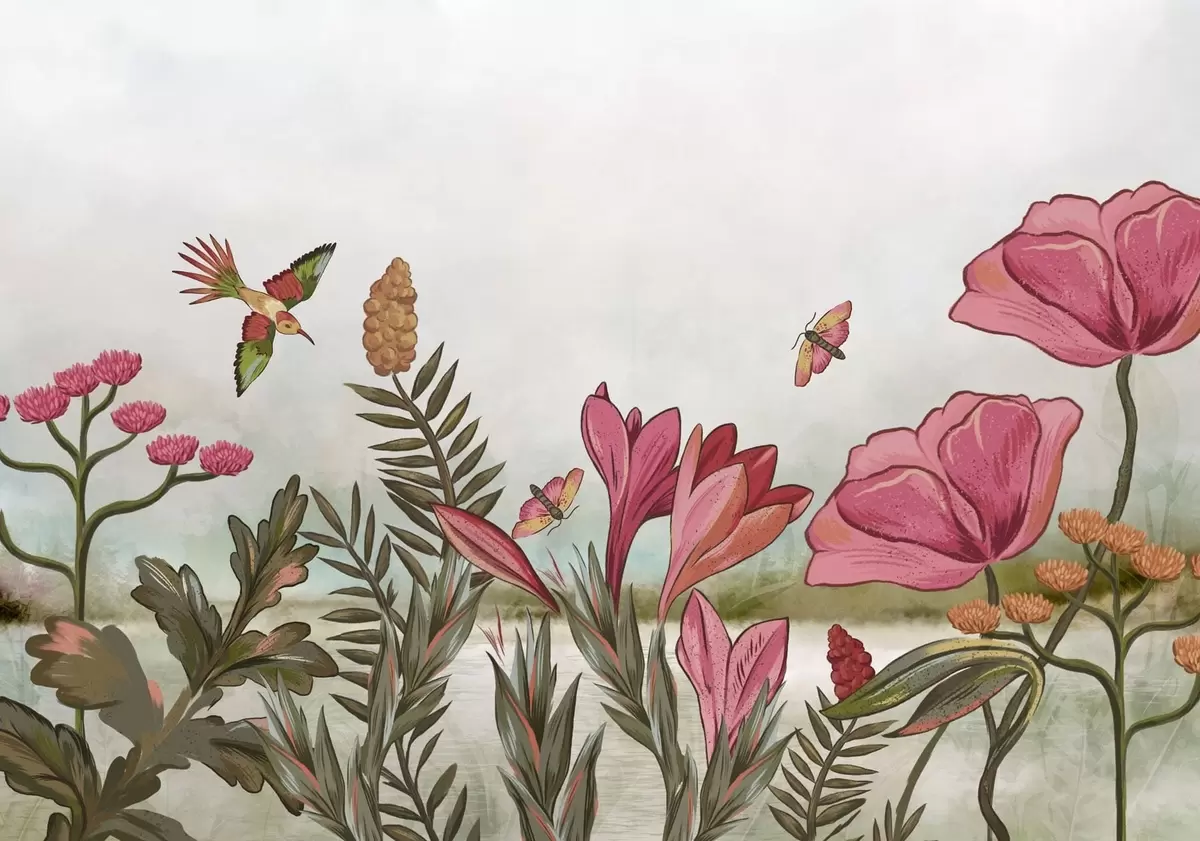 Murais de parede Flores brilhantes com pássaros e borboletas Nr. w05321