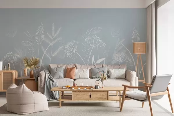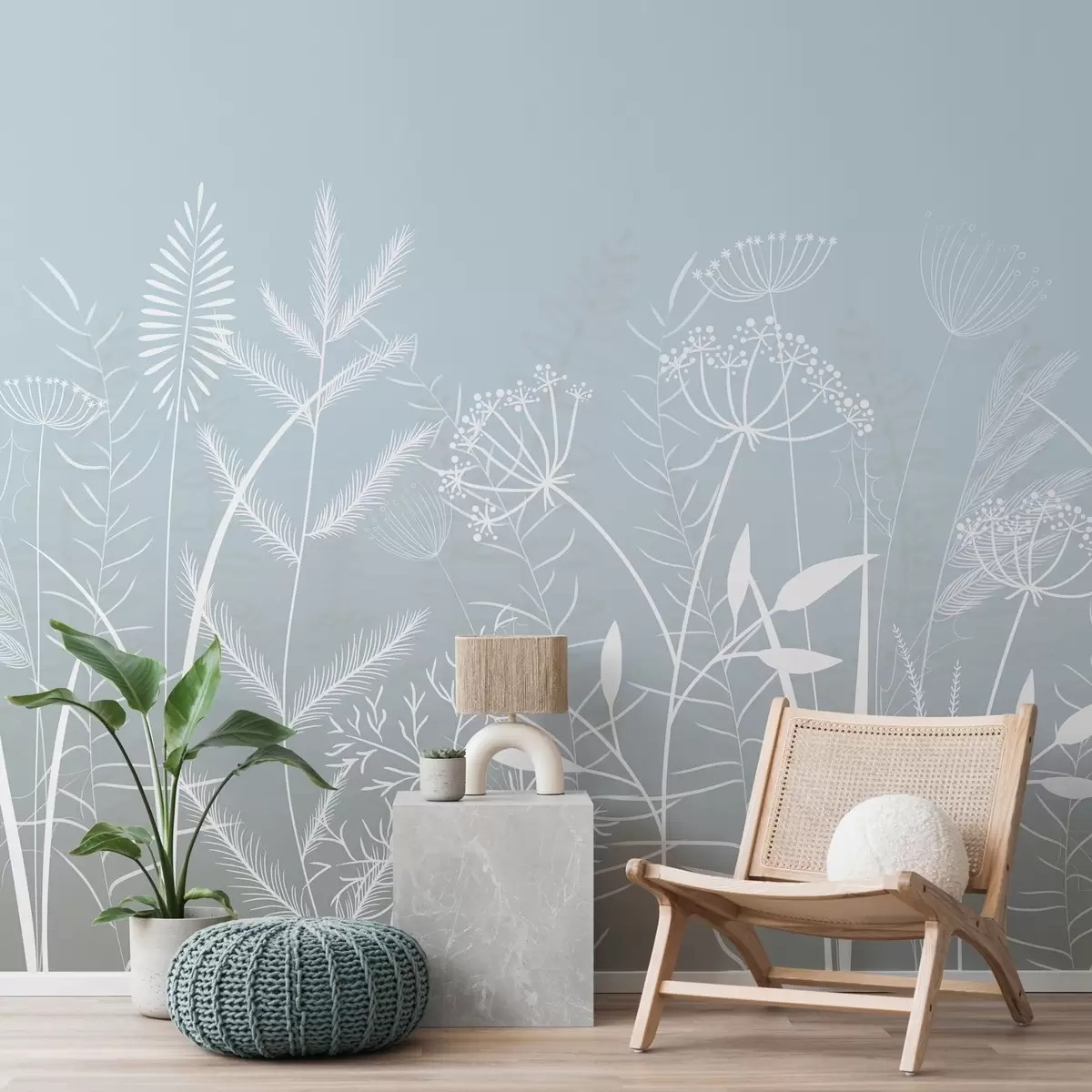 Murais de parede delicadas ervas silvestres e flores pintadas à mão sobre um fundo cinza-azulado Nr. w05383