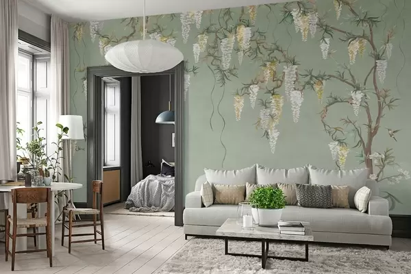 Murais de parede Galhos floridos com flores brancas e pássaros sobre o verde Nr. w05394