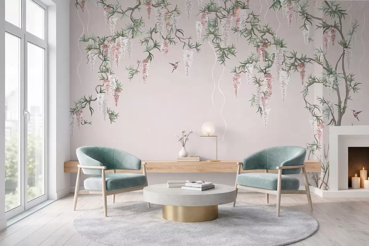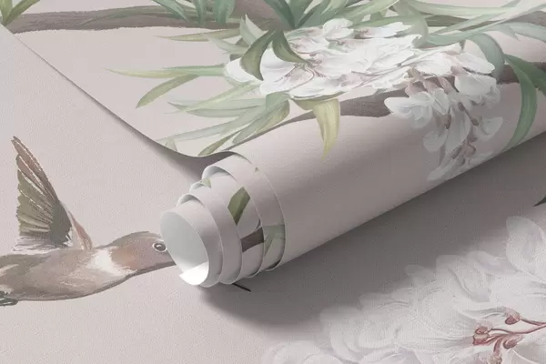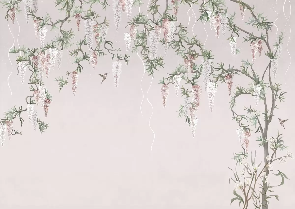 Murais de parede Galhos floridos com flores cor-de-rosa e pássaros Nr. w05394v1