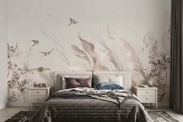 Murais de parede Penas suaves, gramíneas e pássaros em tons claros Nr. w05395