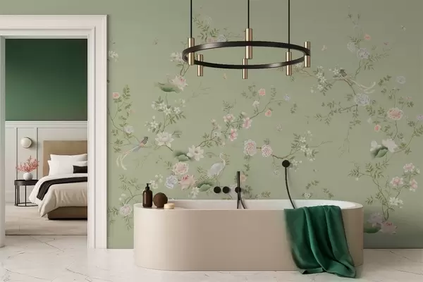 Murais de parede Galhos floridos com pássaros sobre fundo verde claro Nr. w05416