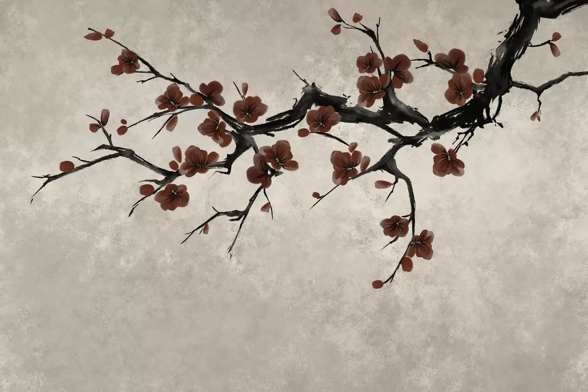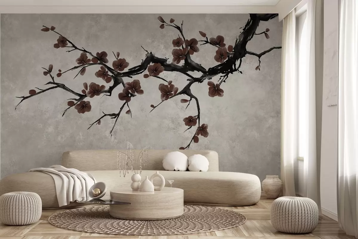 Murais de parede Galho com flores vermelho-escuras sobre fundo neutro Nr. w05425v1