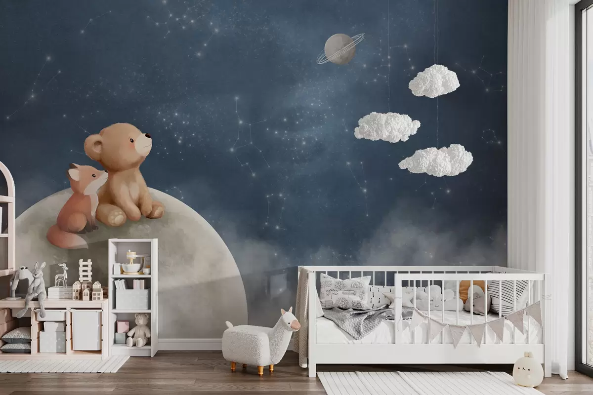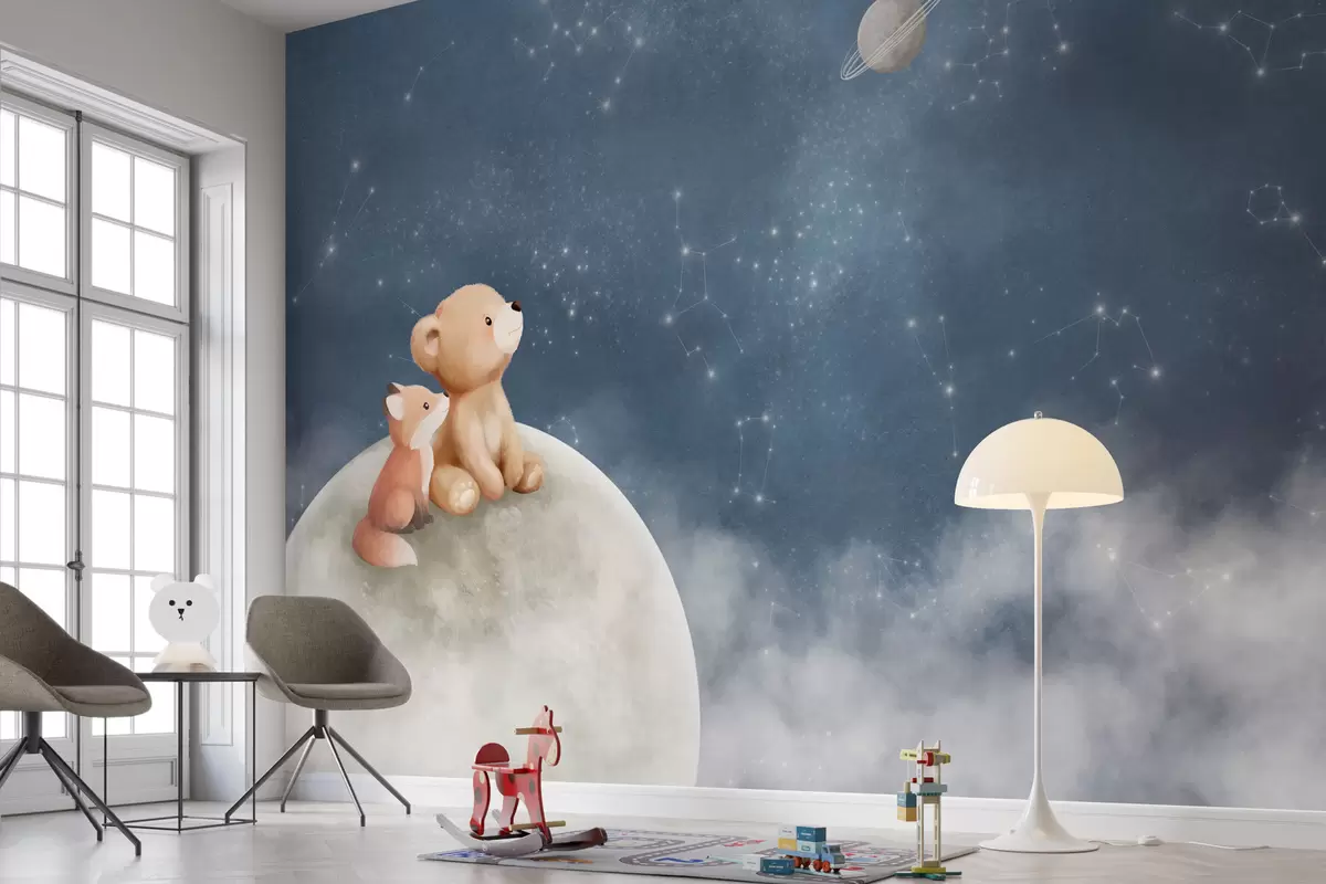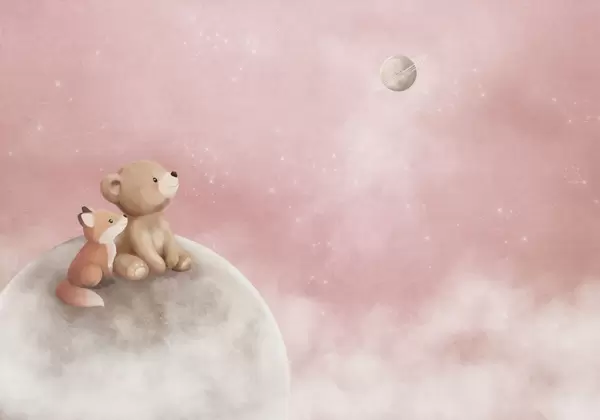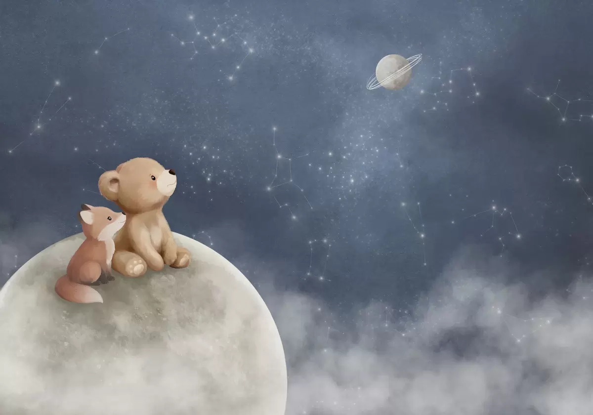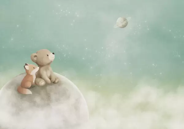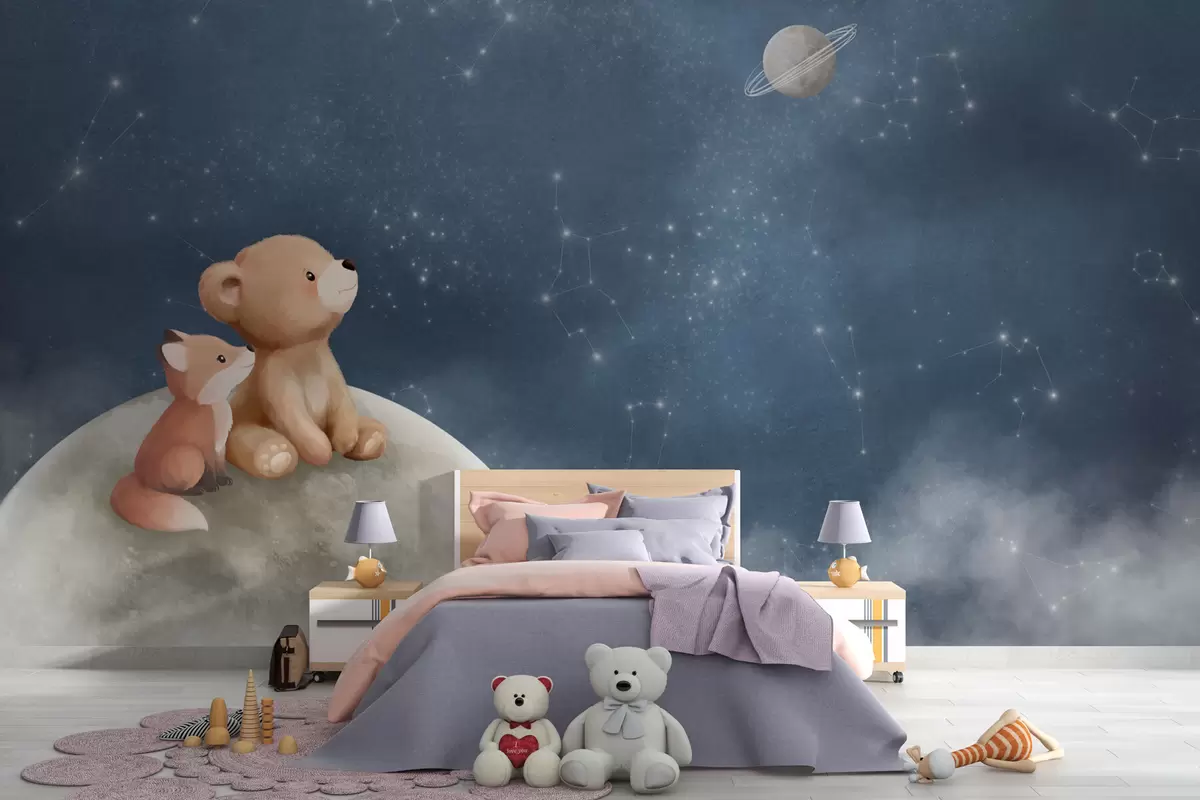 Murais de parede Ilustração em tons pastéis de um urso e uma raposa sob o céu noturno Nr. w05431