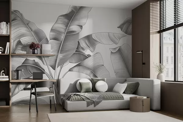 Murais de parede desenhadas grandes folhas de bananeira em tons de cinza Nr. w07877