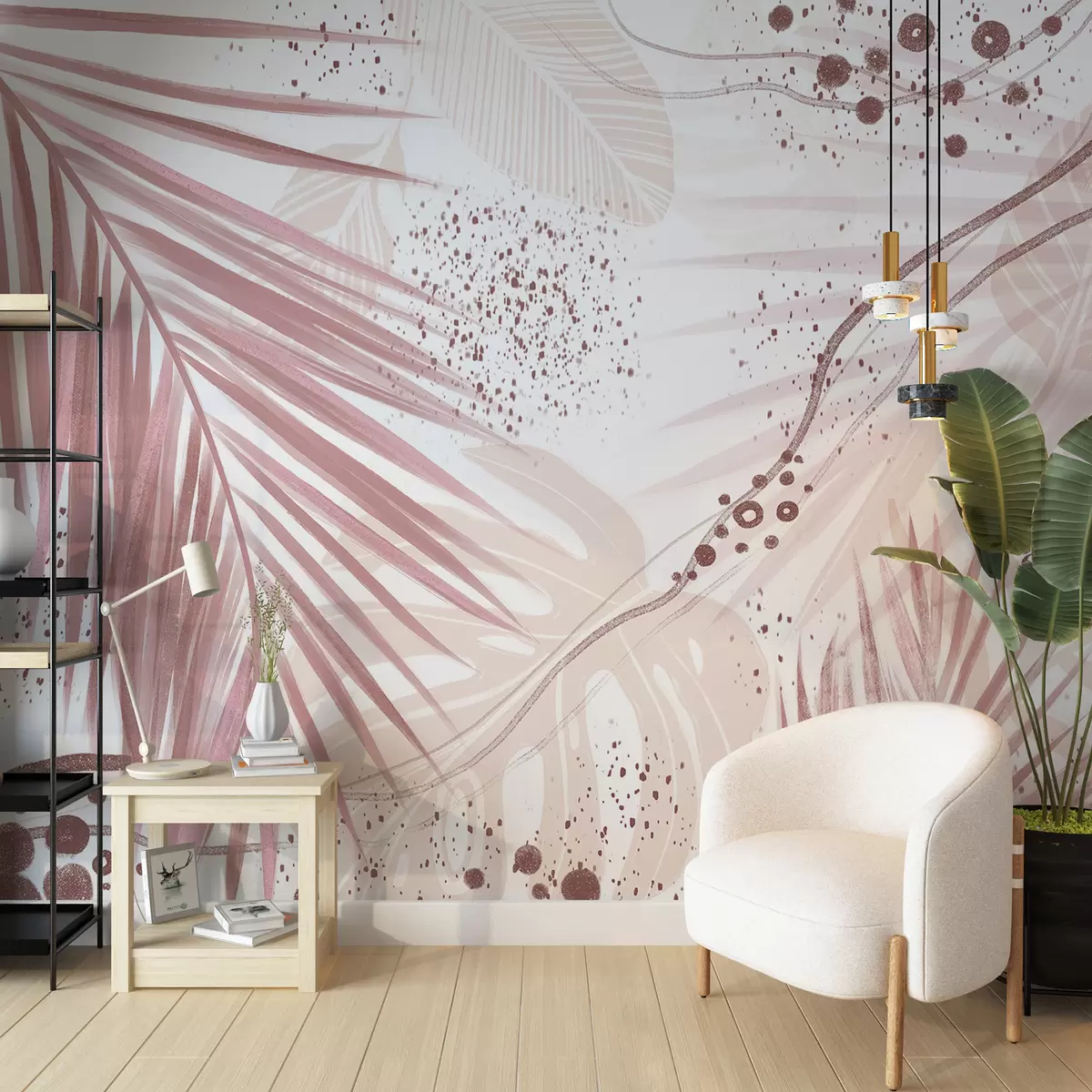 Murais de parede Folhas e folhas de palmeira rosa tropical, com formas abstratas e respingos em tons de rosa e branco Nr. w07918v1