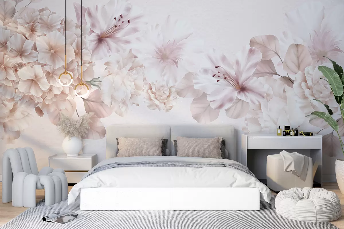 Murais de parede Arranjo floral rosa e branco suave, com delicadas pétalas e flores contra um fundo claro Nr. w07923