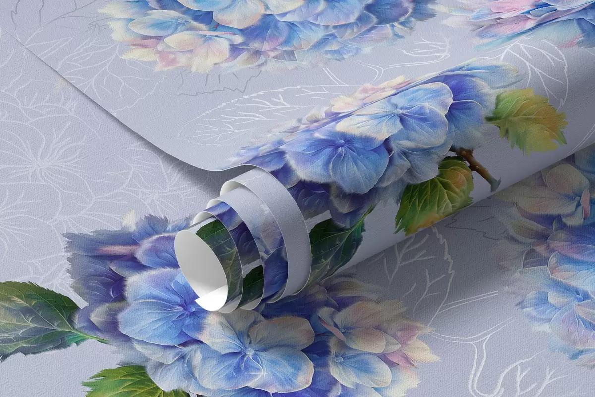 Murais de parede Hortênsias, desenho acrílico, arte linear, botânico, cores violetas Nr. w07942v5