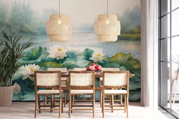 Murais de parede Nenúfares, lago florestal, desenho acrílico, natureza, cores verdes e brancas Nr. w07957
