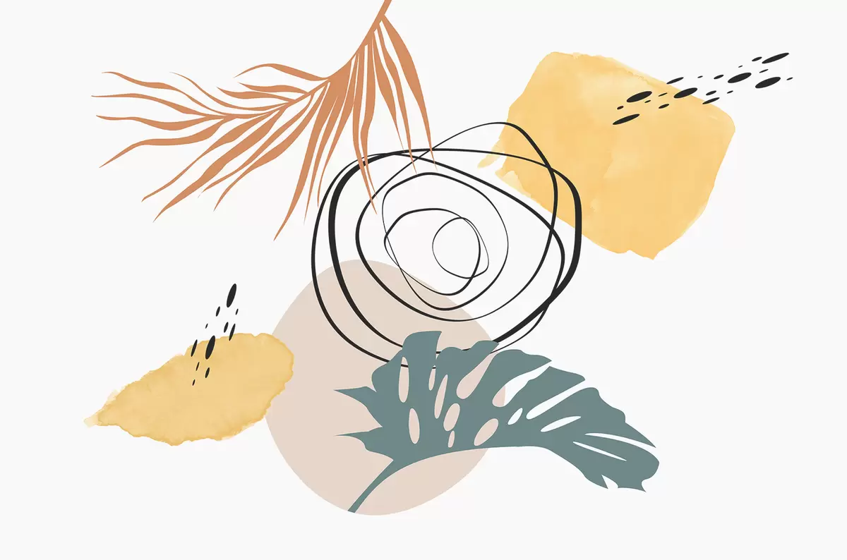 Murais de parede Abstração Boho, monstera tropical e folha de palmeira, geométrica, mancha aquarela, linhas, cor azul, vermelha, amarela Nr. w07959