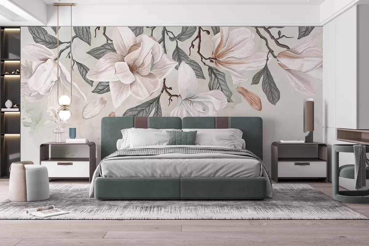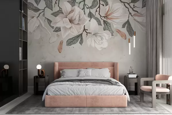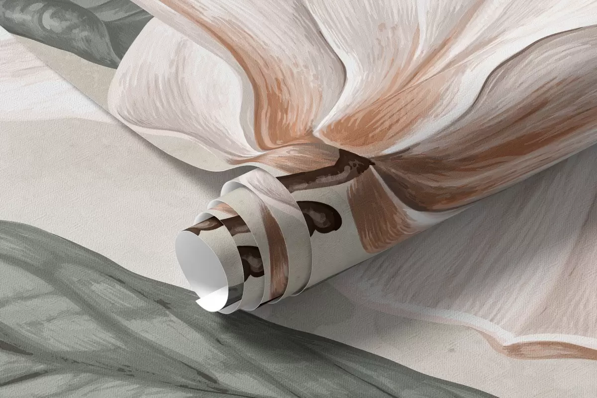 Murais de parede Delicadas flores de magnólia rosa e branca com folhas verdes sobre um fundo claro, uma composição floral suave Nr. w07977