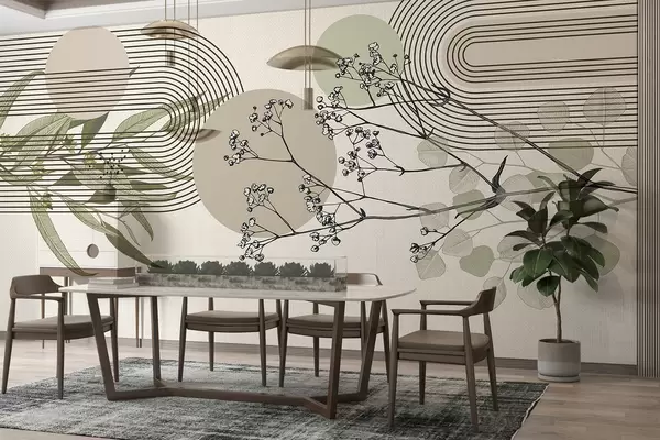 Murais de parede Uma abstração minimalista com formas orgânicas, galhos de árvores estilizados ou plantas com delicados detalhes florais Nr. w07979