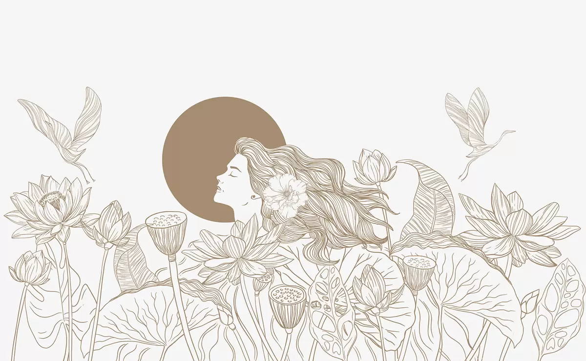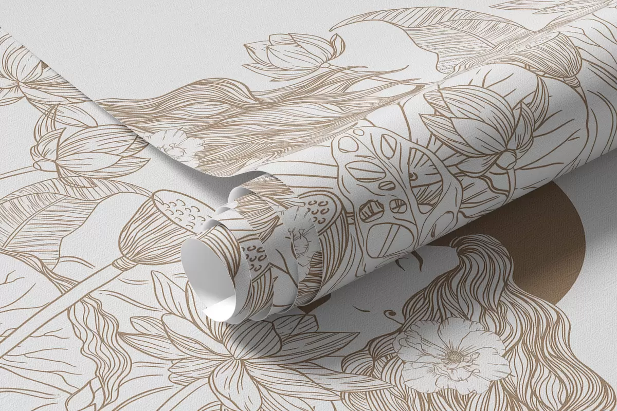 Murais de parede Mulher na natureza, desenho de linha, flores de lótus, folhas grandes, pássaros voadores, cor bege Nr. w07988v1