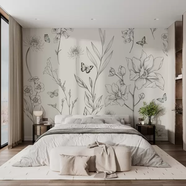 murais de parede Flores e borboletas monocromáticas Boho w08088
