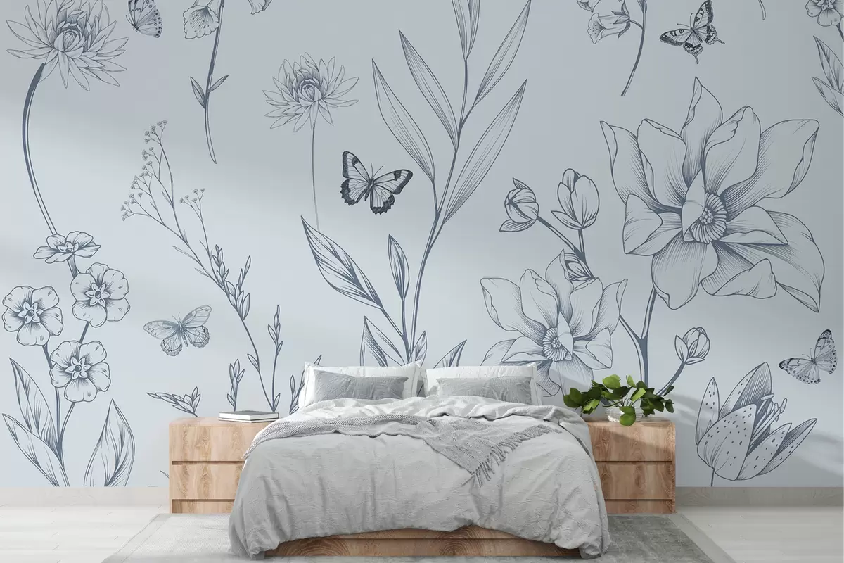 Murais de parede Flores e borboletas monocromáticas Boho em azul Nr. w08088v2