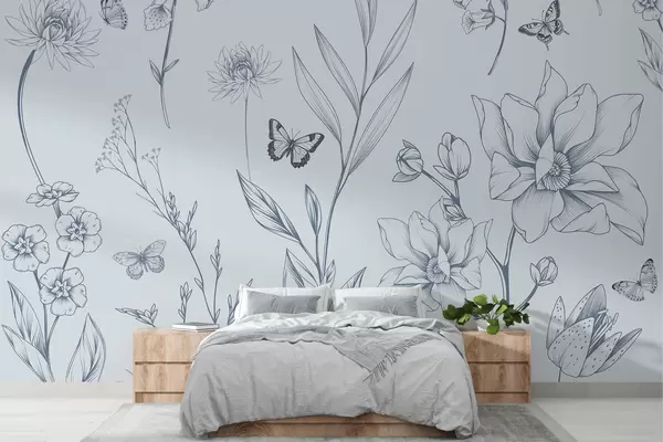 Murais de parede Flores e borboletas monocromáticas Boho em azul Nr. w08088v2