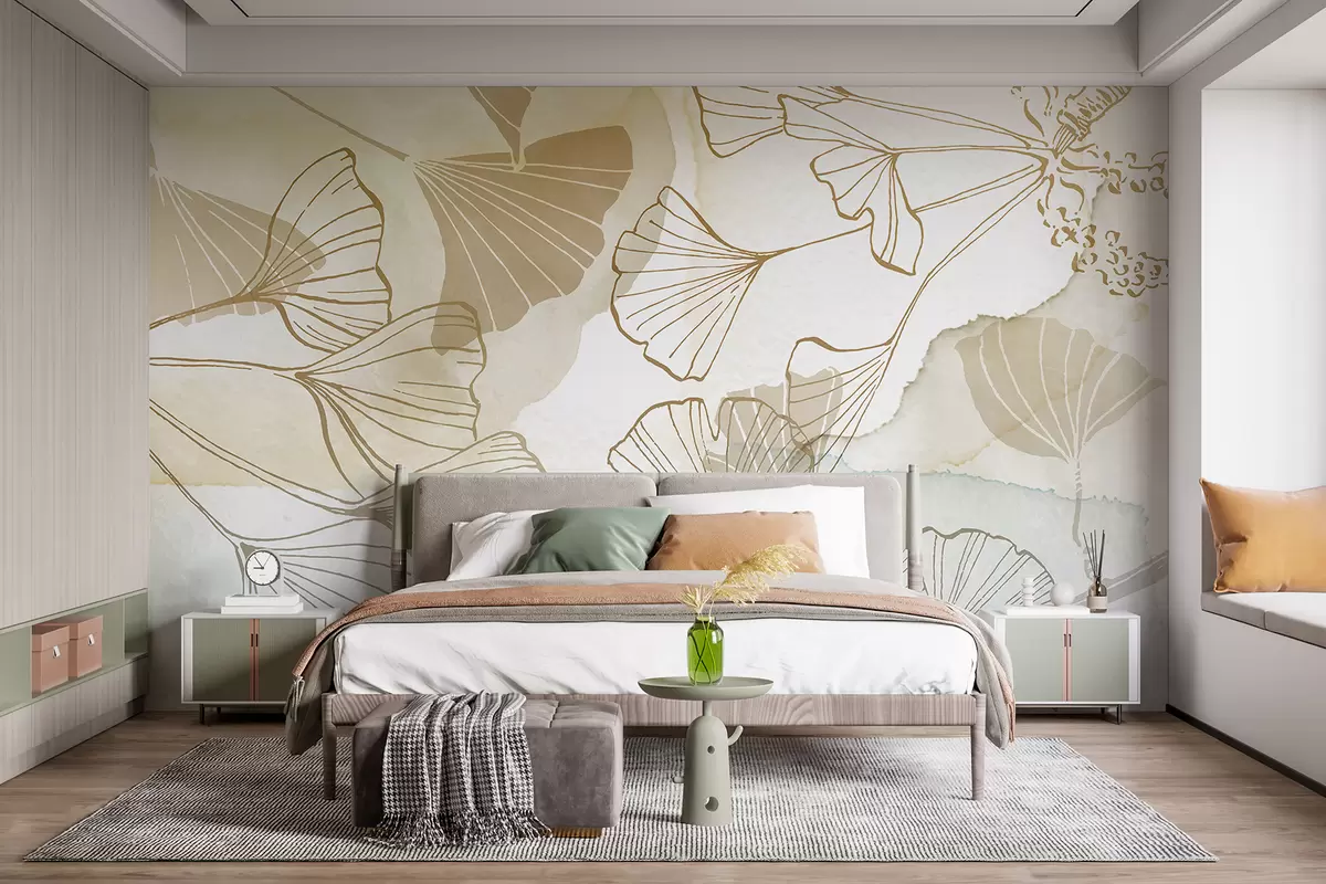 Murais de parede Um padrão de delicadas folhas de ginkgo em tons de bege, castanho e azul sobre um fundo claro Nr. w08157