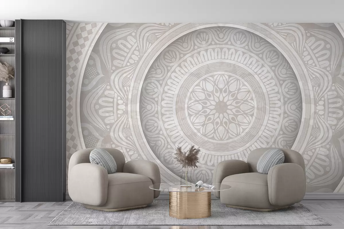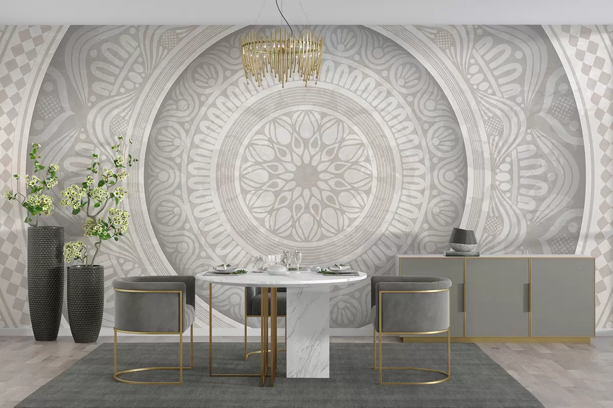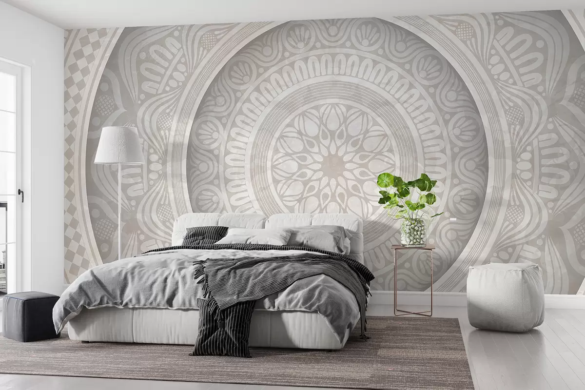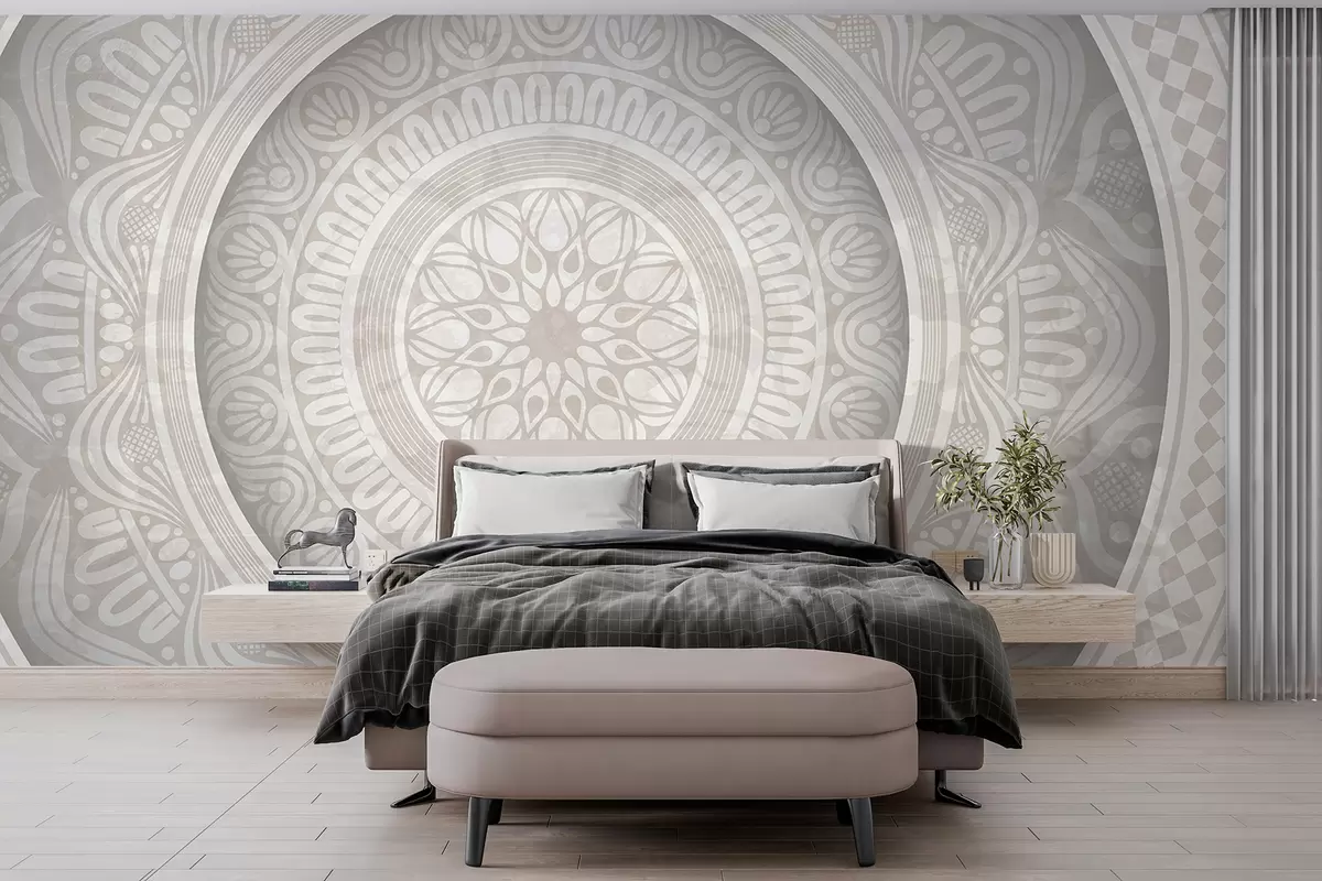Murais de parede Uma impressão de mandala simétrica detalhada em cinza e branco com círculos concêntricos e formas geométricas Nr. w08182