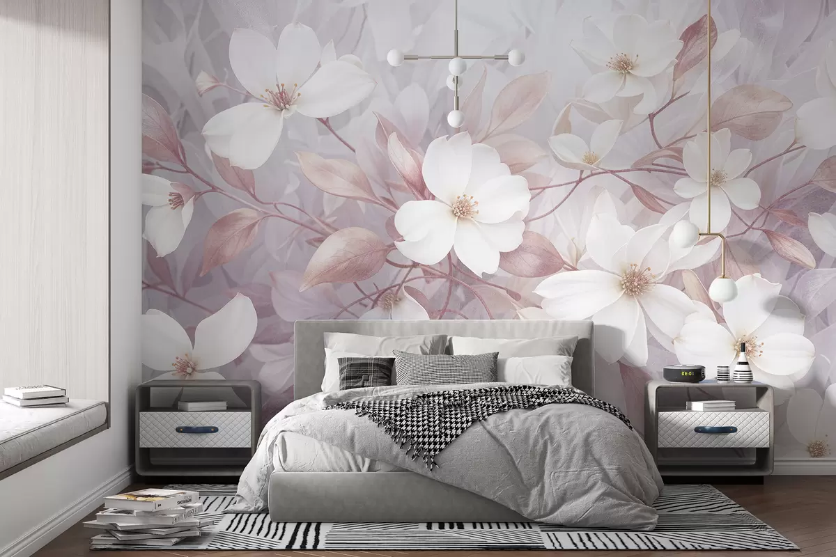 Murais de parede Delicadas flores de magnólia rosa e branca florescendo em galhos suaves e desfocados contra um fundo claro Nr. w08196