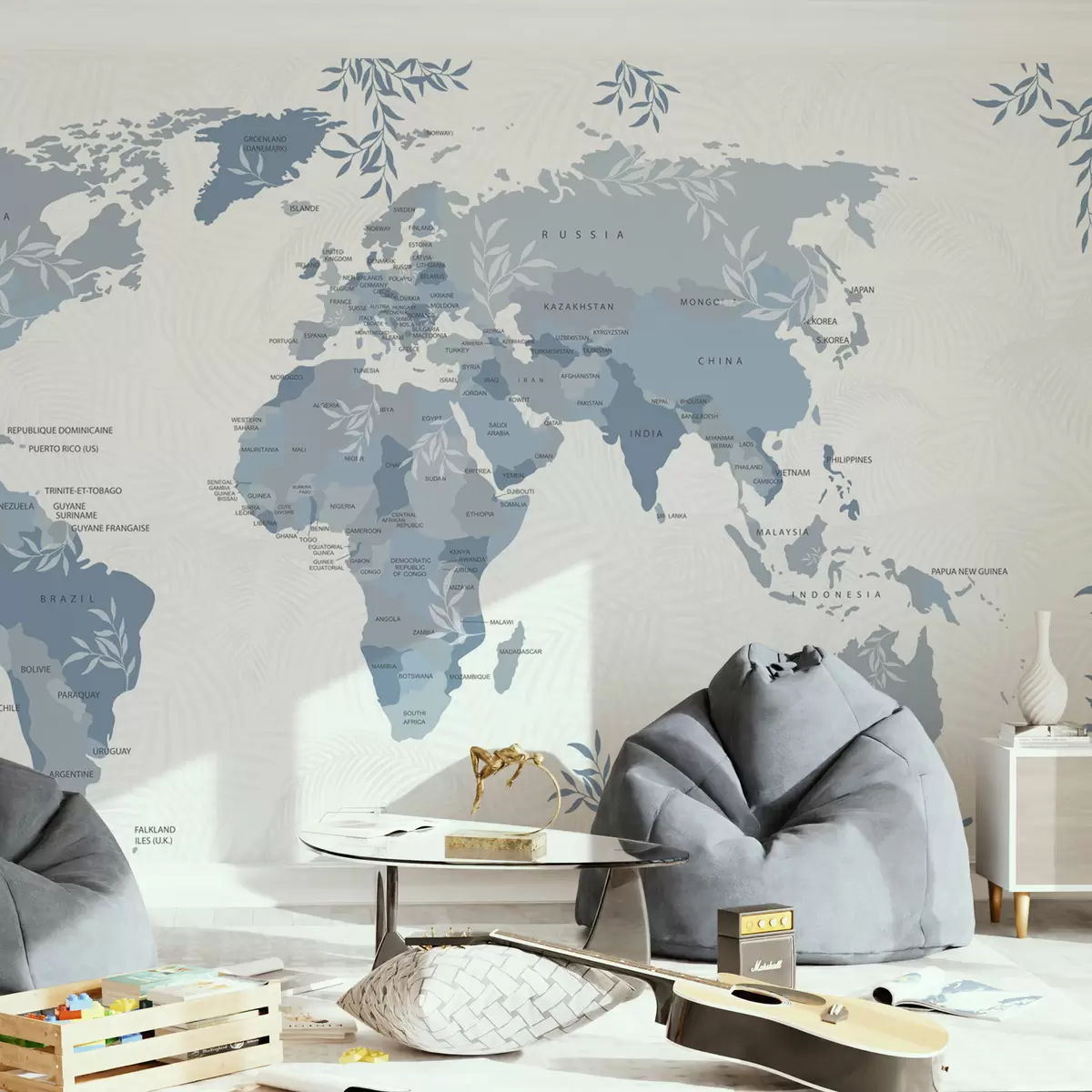 murais de parede Mapa-múndi estiloso com folhas e plantas na cor azul w08211v4