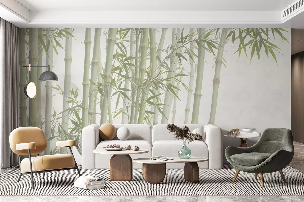 Murais de parede Ur c'hoad bambou stank gant skourroù bambou uhel ha delioù glas war un dremmwel dous ha teñval Nr. w08237