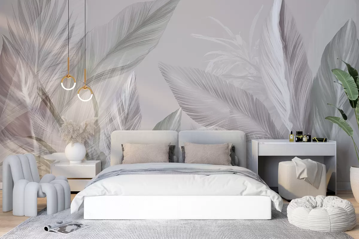 Murais de parede Pluñv gwenn, roz ha gris dous ha delioù trovanel o nijal war un dremmwel sklaer Nr. w08241v1