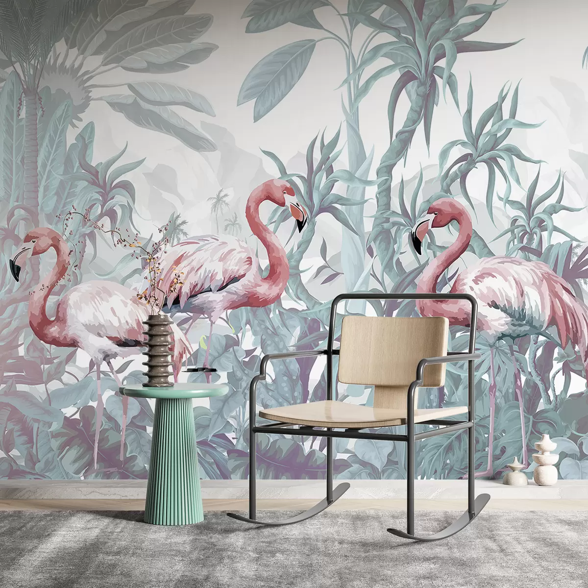 Murais de parede Flamingos cor-de-rosa em uma exuberante folhagem tropical com grandes folhas de palmeira e flores em tons de verde e branco Nr. w08250v1