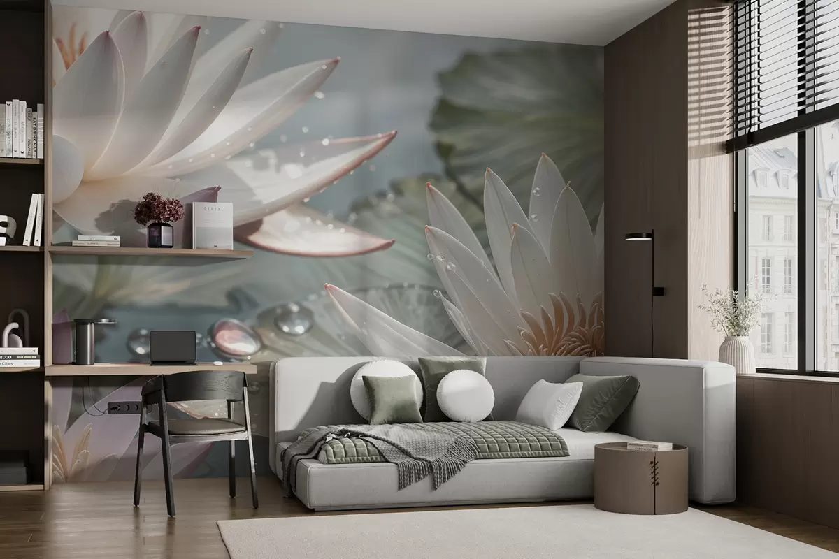 Murais de parede Um close-up de flores de lótus brancas com gotículas de água em suas pétalas contra um fundo verde desfocado Nr. w08252