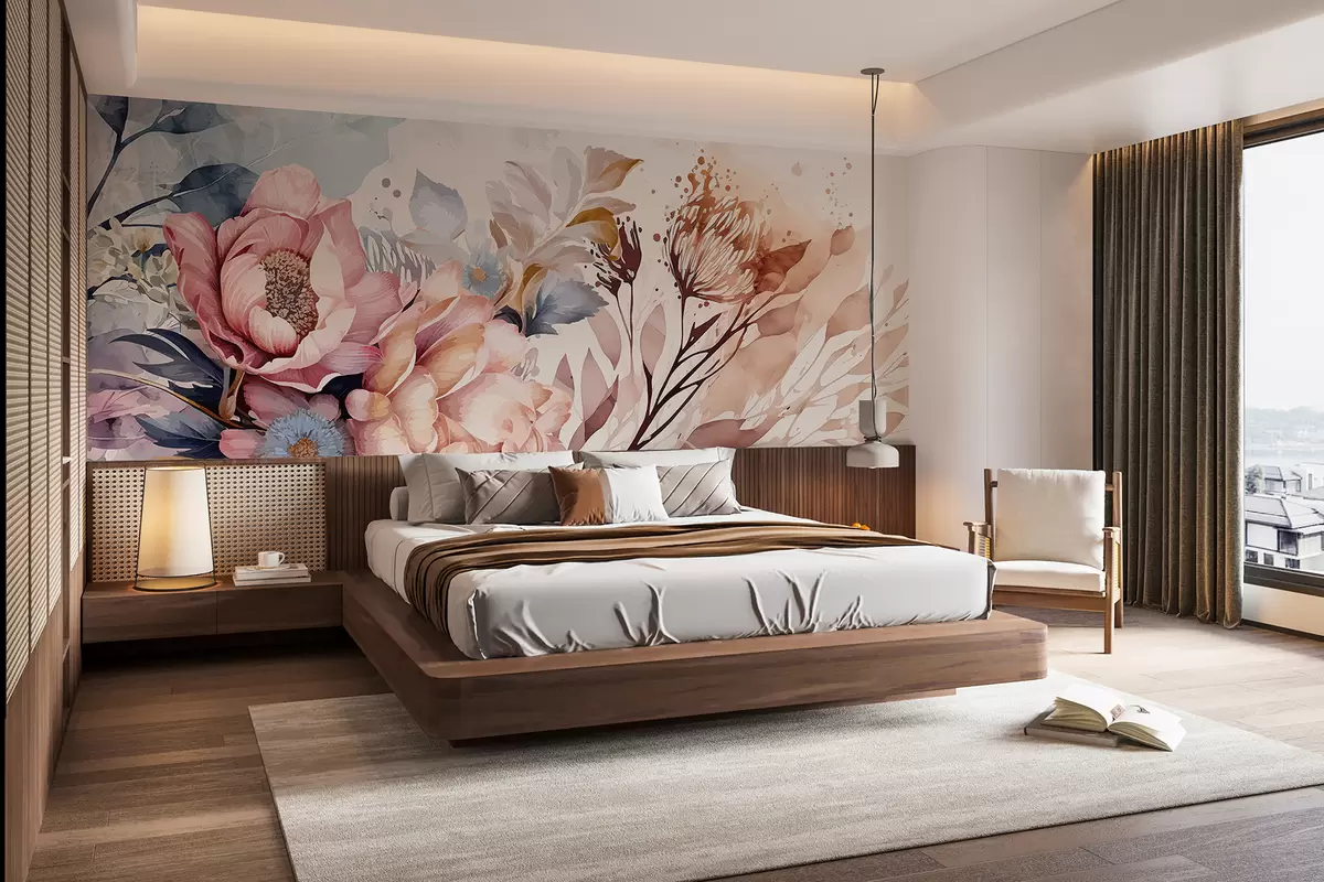 murais de parede Grandes flores rosa e azuis com pétalas delicadas, cercadas por flores menores em um fundo de aquarela w08256