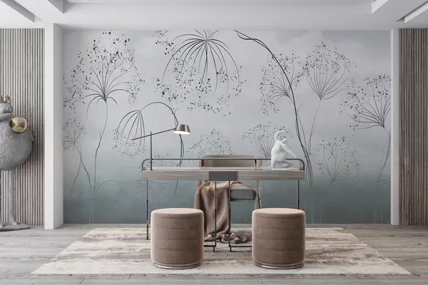 Murais de parede Plantas azuis altas e finas com flores delicadas em forma de guarda-chuva ou cabeças de sementes em um ambiente nebuloso e atmosférico Nr. w08258v1